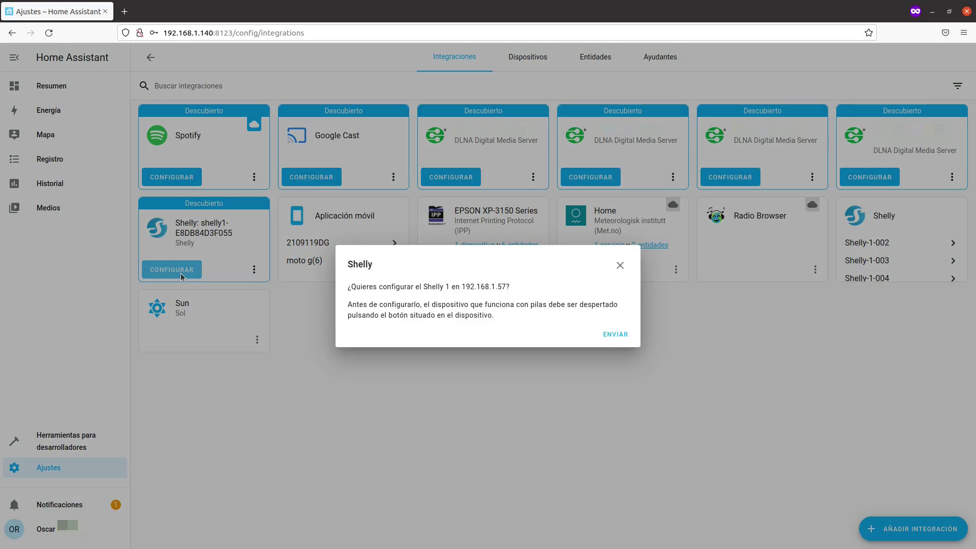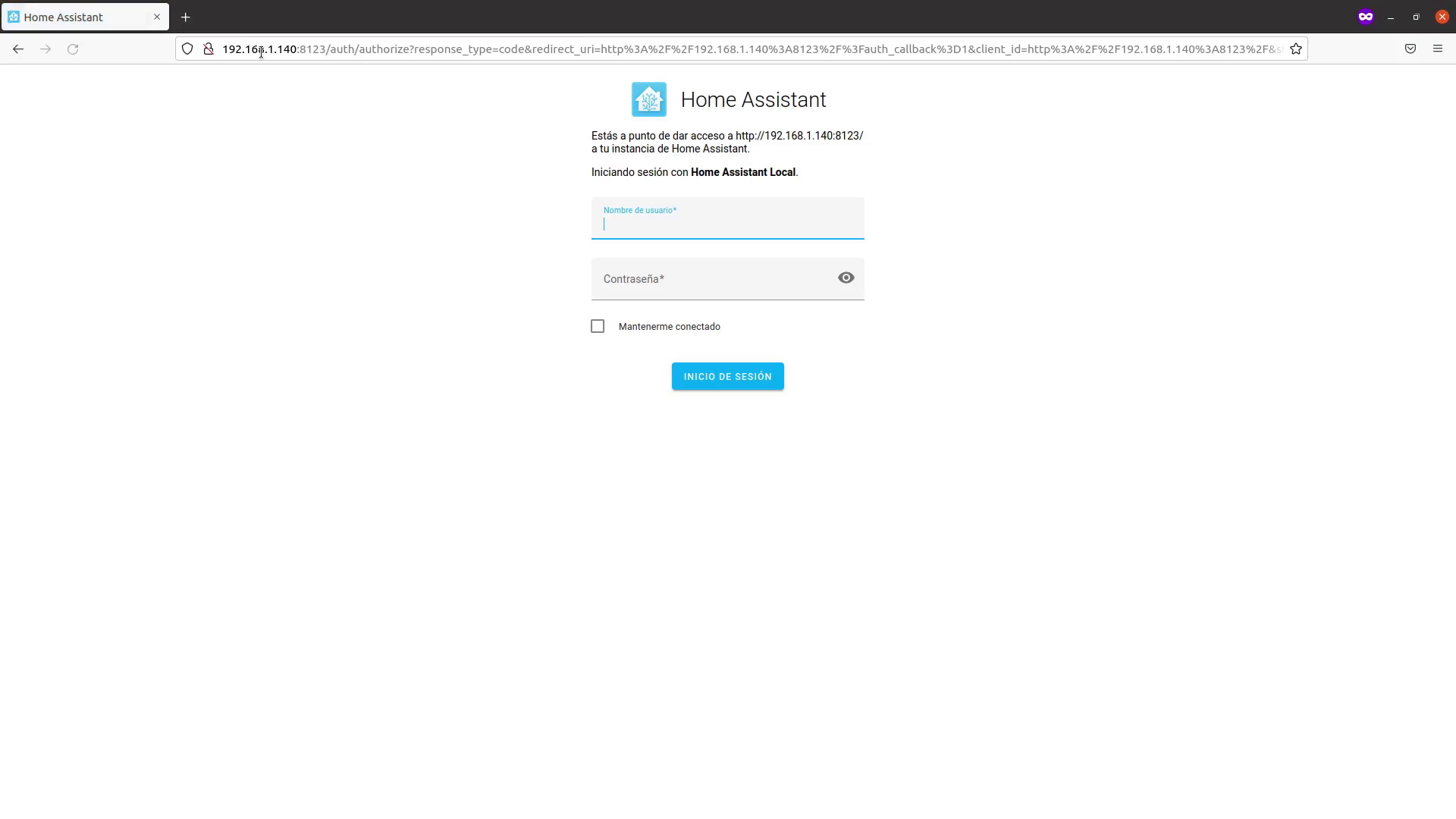 Para añadir el Shelly 1 a nuestro Home Assistant accedemos a este, mediante nuestro navegador web usando la IP del equipo donde esté instalado e indicándole el puerto correspondiente (por defecto es 8123).
