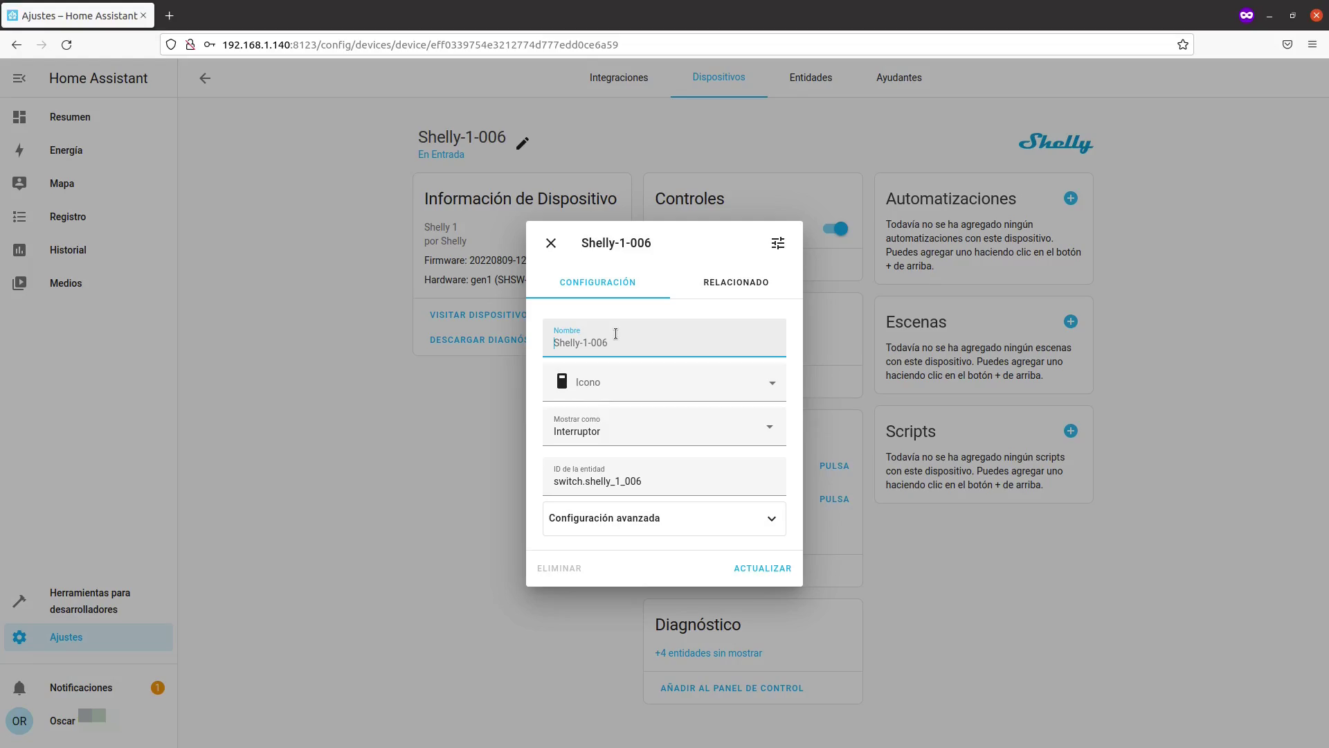 Ahora cambiaremos el nombre del Shelly 1 dentro de Home Assistant para identificarlo mejor y también le asignaremos un icono diferente (estos pasos son opcionales, pero son muy útiles)